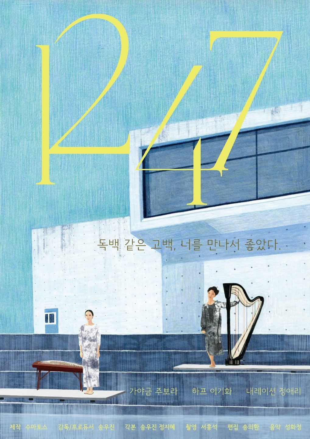 음악 다큐멘터리 영화 <1247>은 동서양 음악의 만남, 현과 현의 만남을 담고 있습니다. 바로 동양의 악기인 가야금과 서양의 악기인 하프가 등장하는 영화입니다. 가야금의 12현과 하프의 47현이 조화를 이뤄서 아름다운 음악을 담고 있는 작품입니다. 그래서 영화 제목도 <1247>로 짓게 되었습니다.